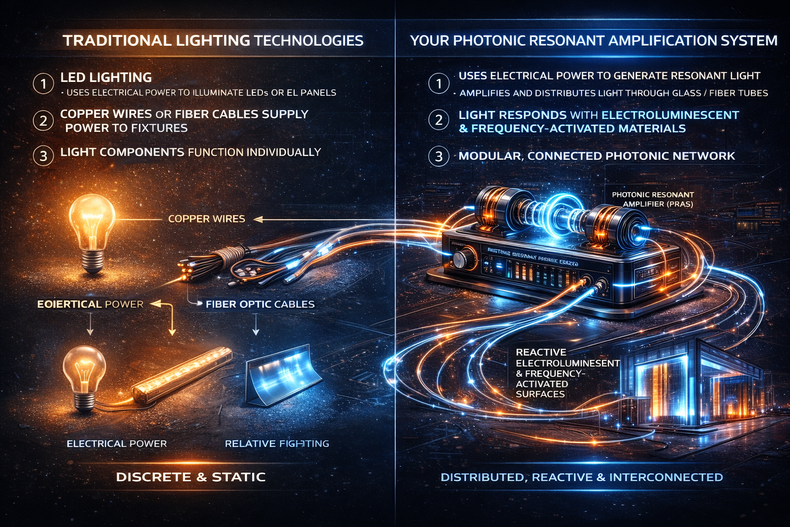 A novel system that uses acoustic and electromagnetic resonance to amplify light emission in engineered photonic layers — enabling illumination without traditional bulbs, LEDs, or filaments.